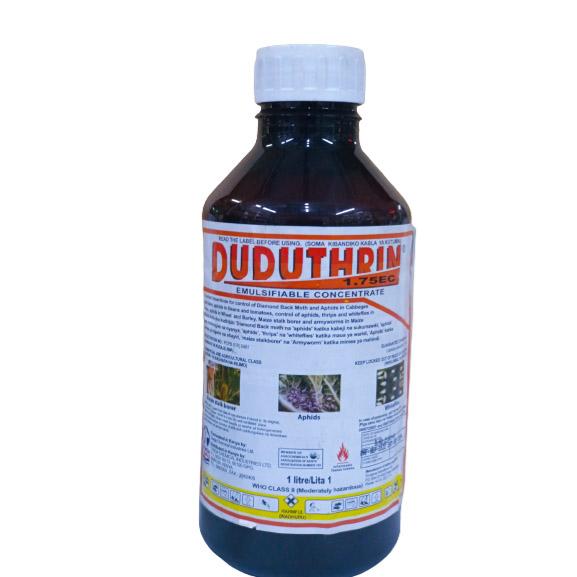 Duduthrin 1.75EC is a  contact insecticide for control of Diamond Back Moth and Aphids in Cabbages and Kales, sucking and chewing insects in Beans and tomatoes, aphids, thrips and whiteflies in roses, aphids in Wheat and Barley, Maize stalk borer and armyworms in Maize