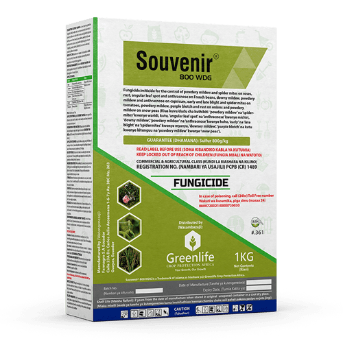 Souvenir 800WDG is a broad-spectrum protective fungicide/miticide with contact and vapor action for the control of various diseases on agricultural crops.